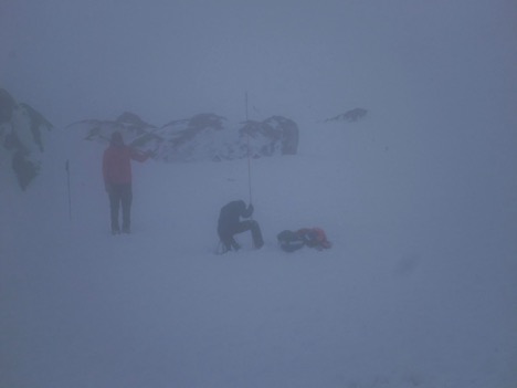 One of the poor-weather days was put to good use in training for avalanche awareness, search and recovery. The group spent the morning covering avalanche theory: The different types of avalanche, the risk factors, and in-field identification of avalanches and avalanche terrain. There were not-infrequent reminders of the avalanche danger that could be heard and occasionally seen in the surrounding mountains. This was followed by practice locating avalanche transceivers, at first inside the hut and later competing for the fastest time to locate avalanche beacons buried in the snow. The day ended with a scenario involving three buried “victims” and requiring both a transceiver search and an avalanche probe line.