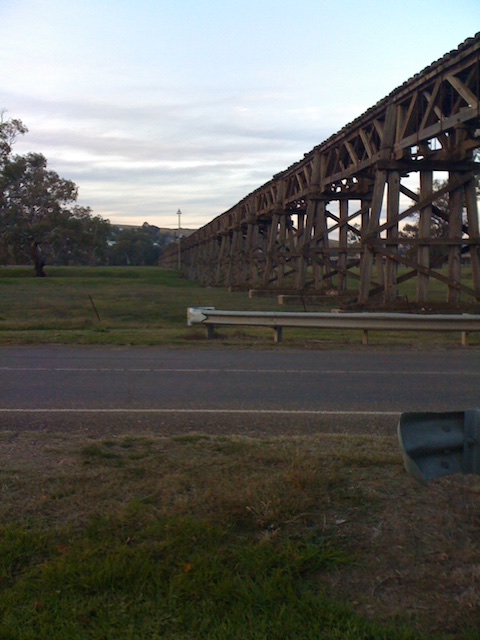 Time for my longest ride ever. At the beginning of my longest stretch of cycling ever. It still seems pretty silly, but getting Caddy to drive me to Yass to start the journey seems like a bit of a cop-out. 158km from Gungahlin to Gundagai. I dealt with it fairly capably, with a short break for real food (a sandwich) about 4 hours into the 6 hour ride. On arrival at Gundagai River Caravan Park I discovered that the clamps attaching my rack to the seat stay on my bike’s frame had slipped down the frame and were chipping away at the welds on the frame. After a short time panicking and considering calling Caddy for a rescue I confirmed that the weld was structurally sound, cut up a spare tube and wrapped the seat stay in rubber to protect it and prevent slippage. With repairs completed I showered (this was soon to become a highlight of my days), cleaned my tyres, stretched and ate a tremendous amount before wondering what I should do next. After spending a couple of hours reading H.P. Lovecraft’s ‘Call of Cthulu’ on my iPhone I walked into town to find more food. A cold night on an uncomfortable bed followed.