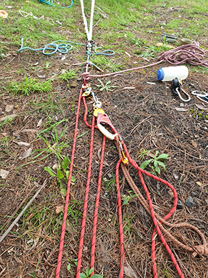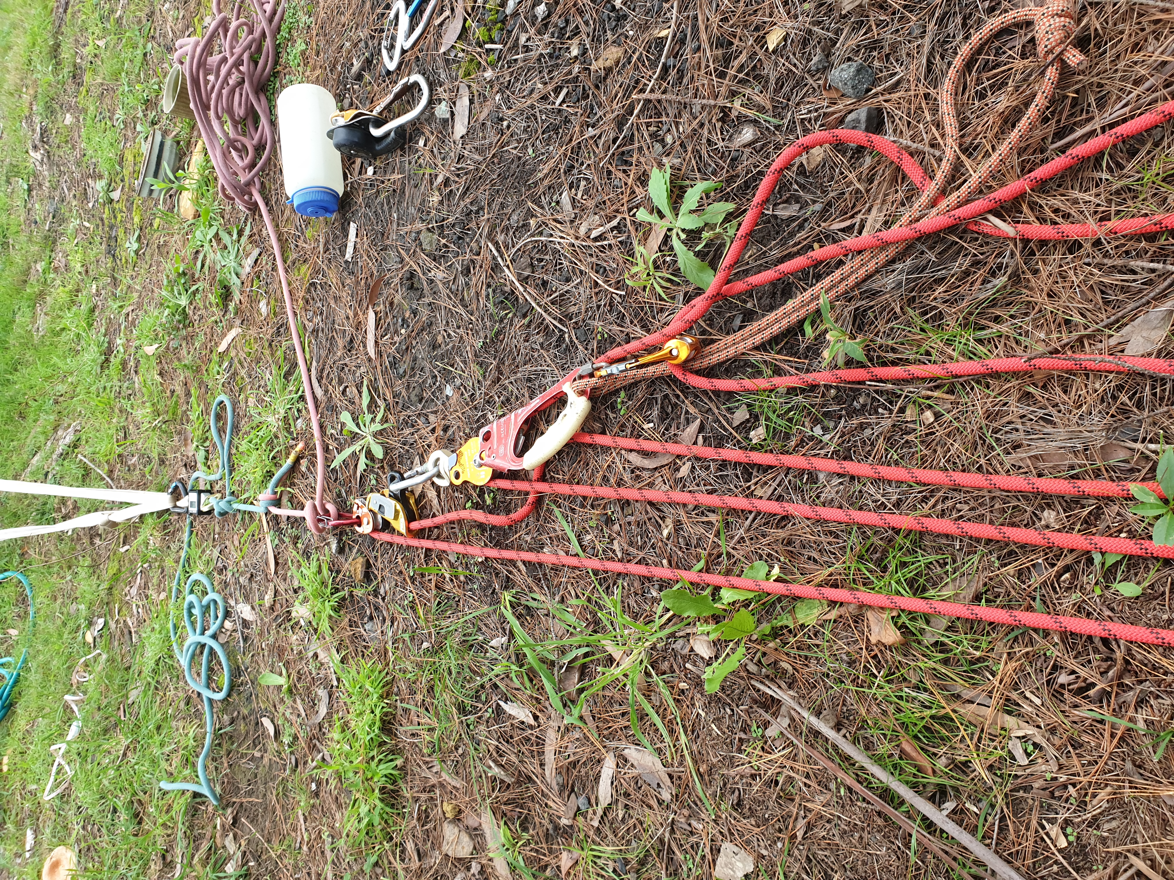 - The second rope being tested was attached to an 8:1 mechanical advantage system (a compound system of three 2:1 systems), again using a bowline;