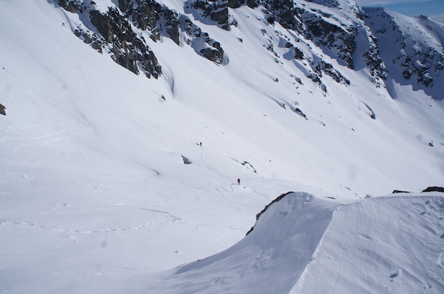 I enthusiastically jumped straight on ‘Alta Ego’, the middle route, but got nervous by a very soft (snowy) vertical section that seemed both quite difficult and impossible to protect a fall from with any degree of safety, and abandoned the climb after about 20m.