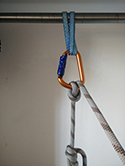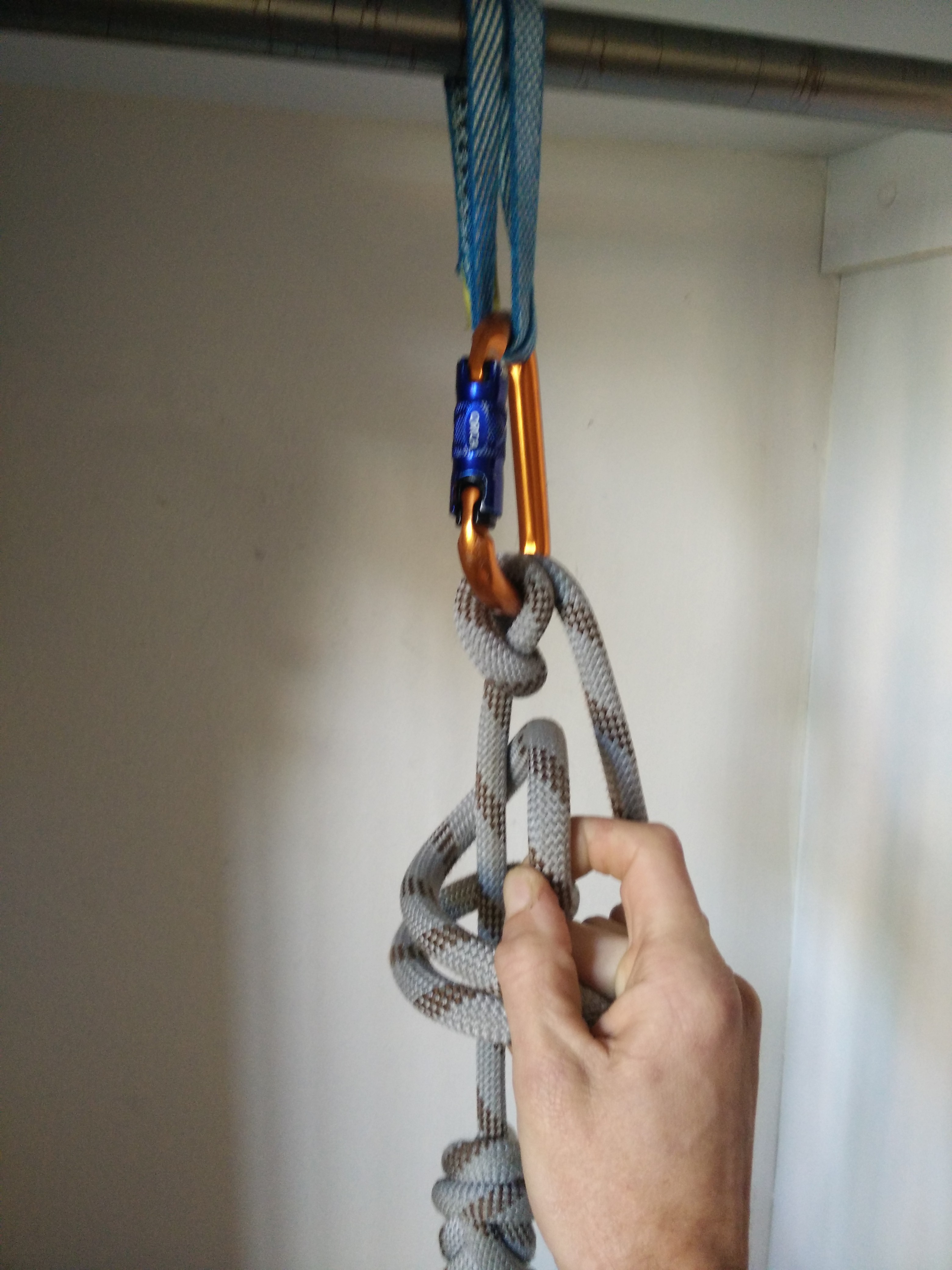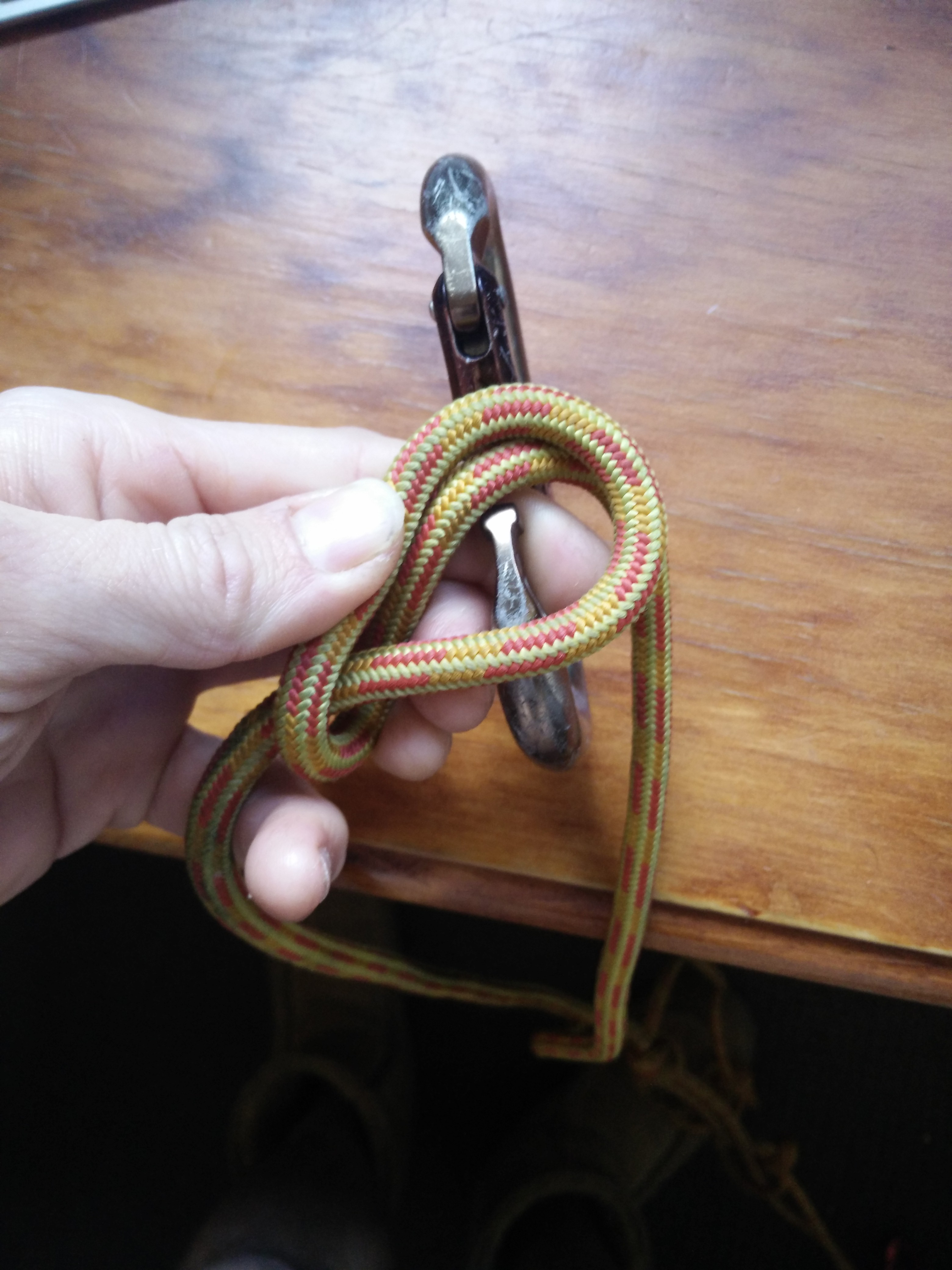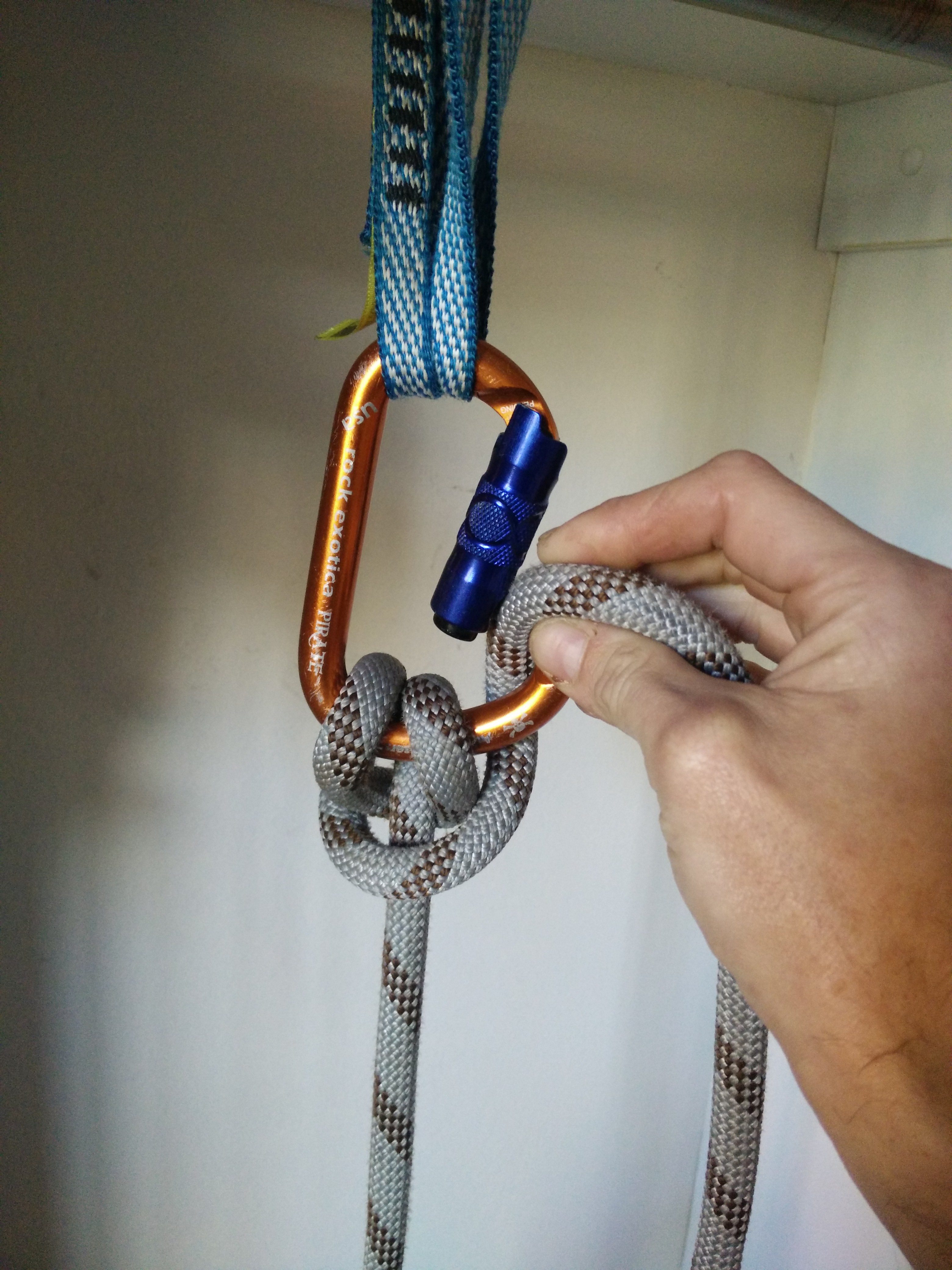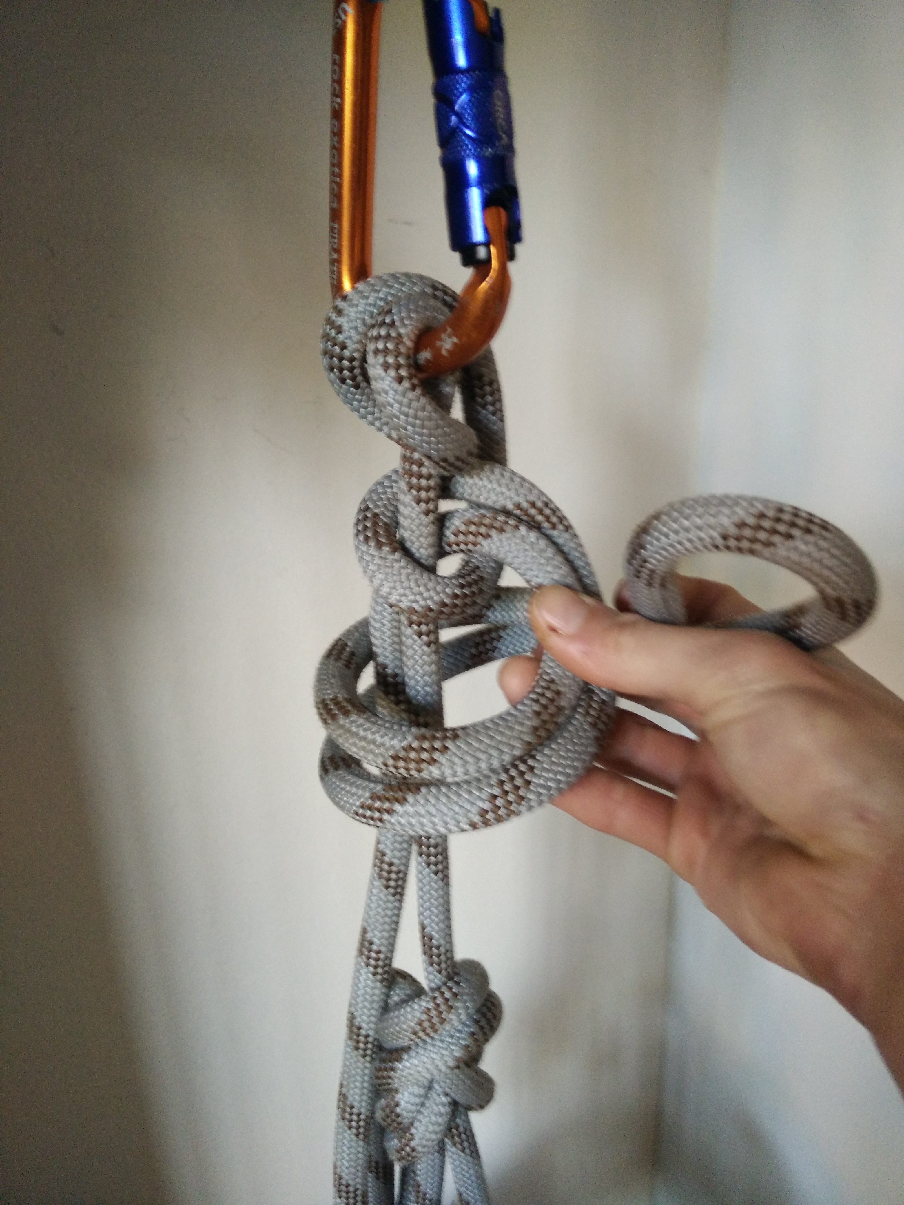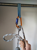 Finally, take your carabiner and attach it to whichever two sections of rope are running next to each other.