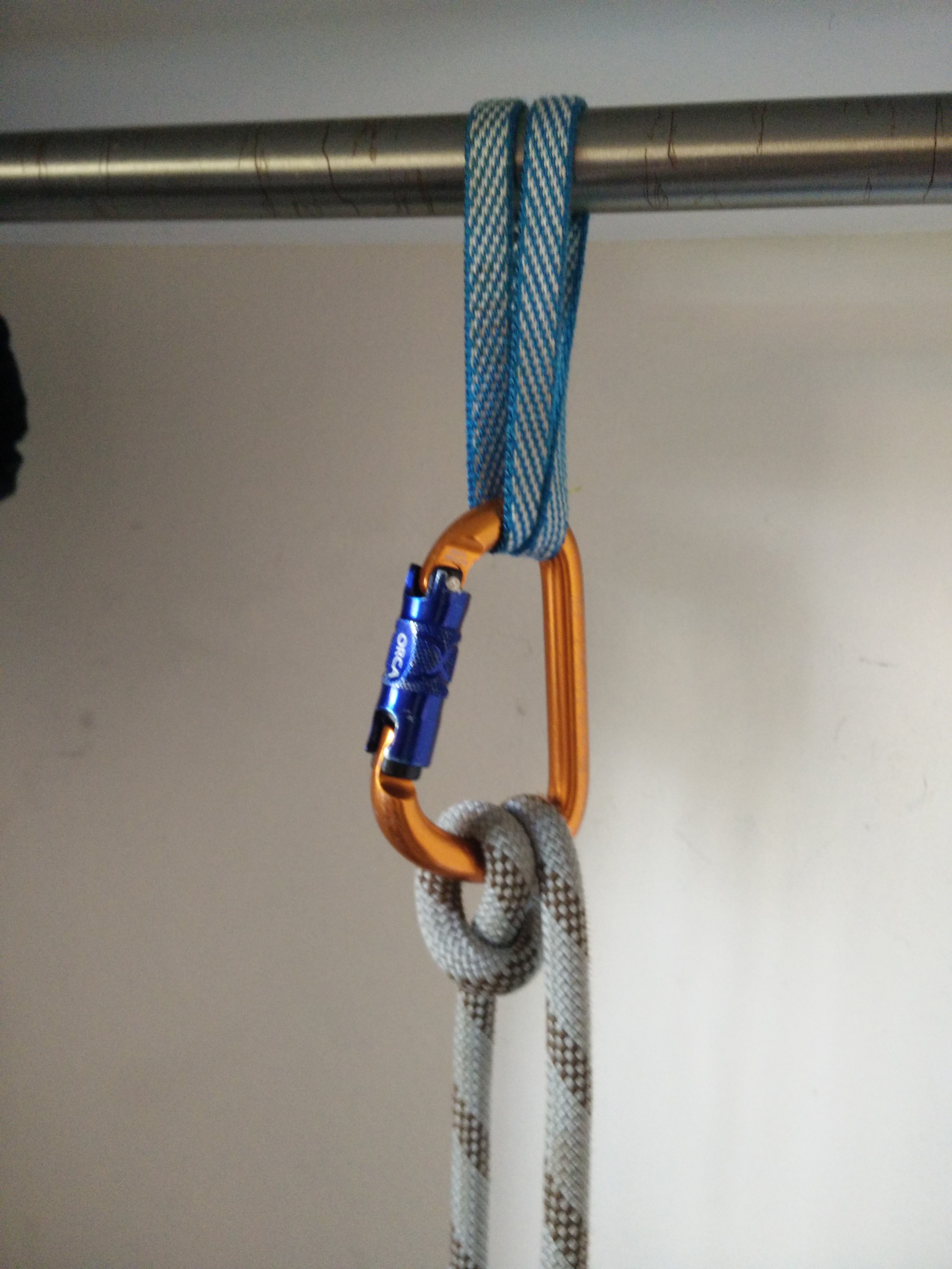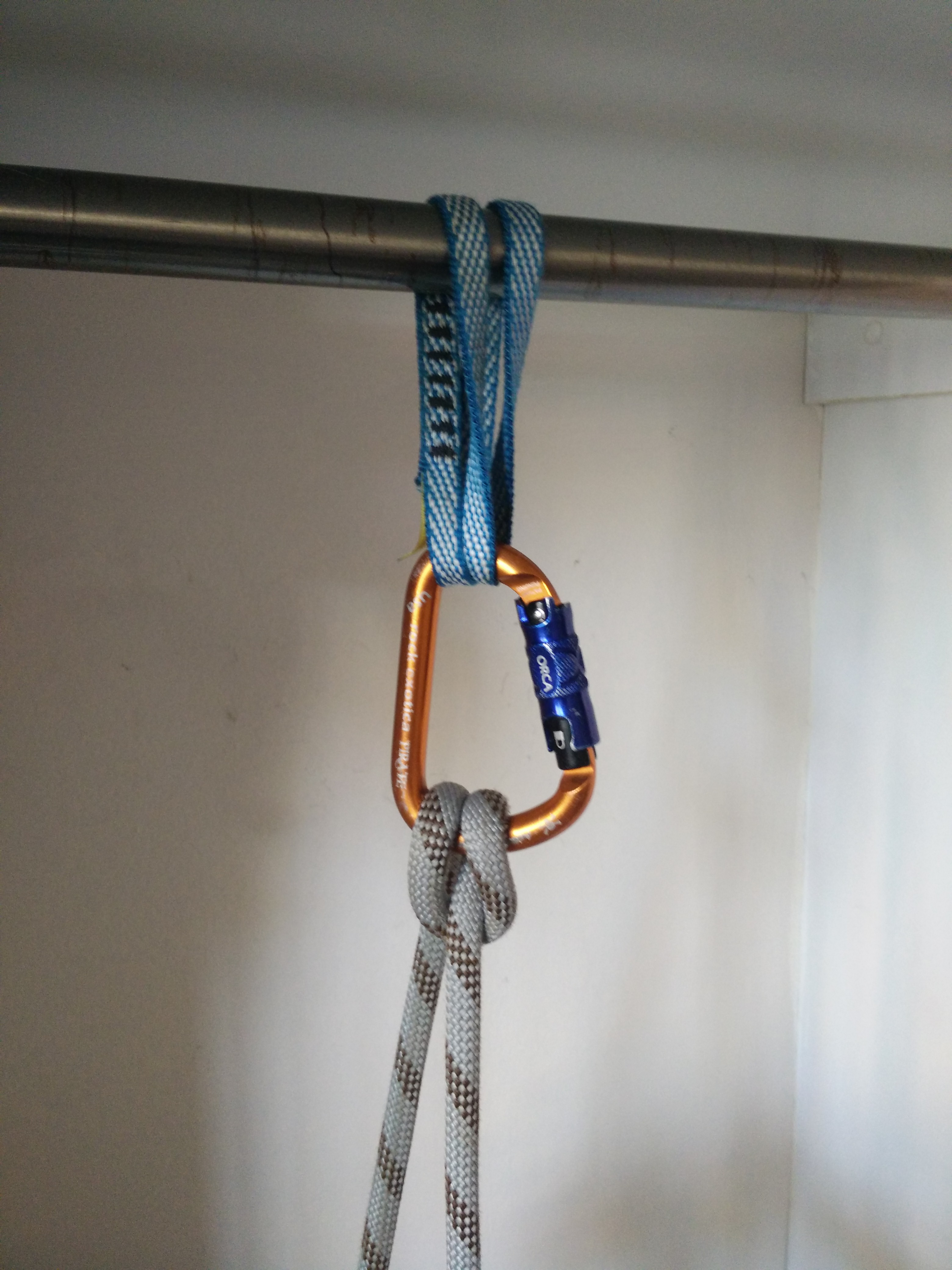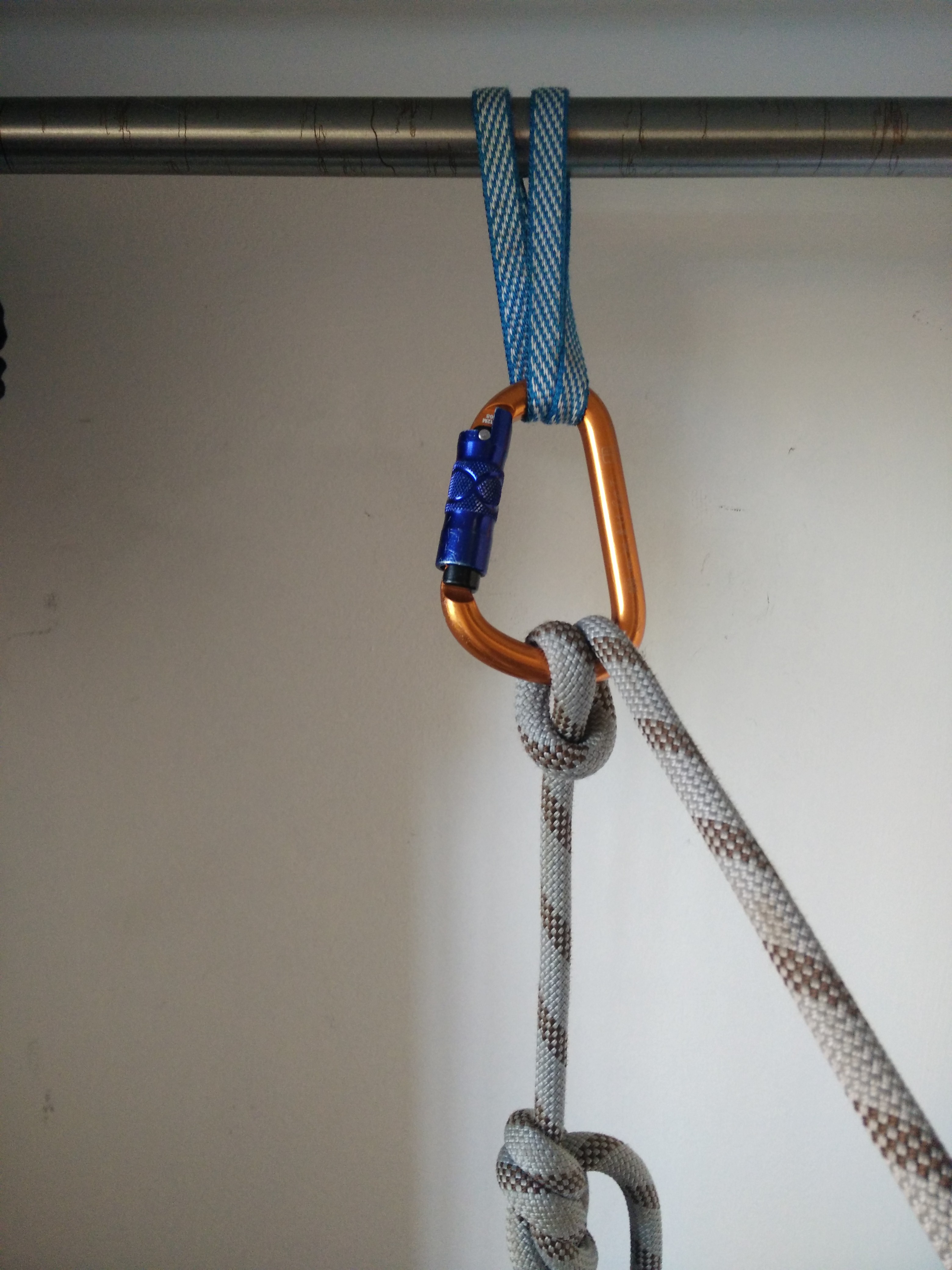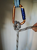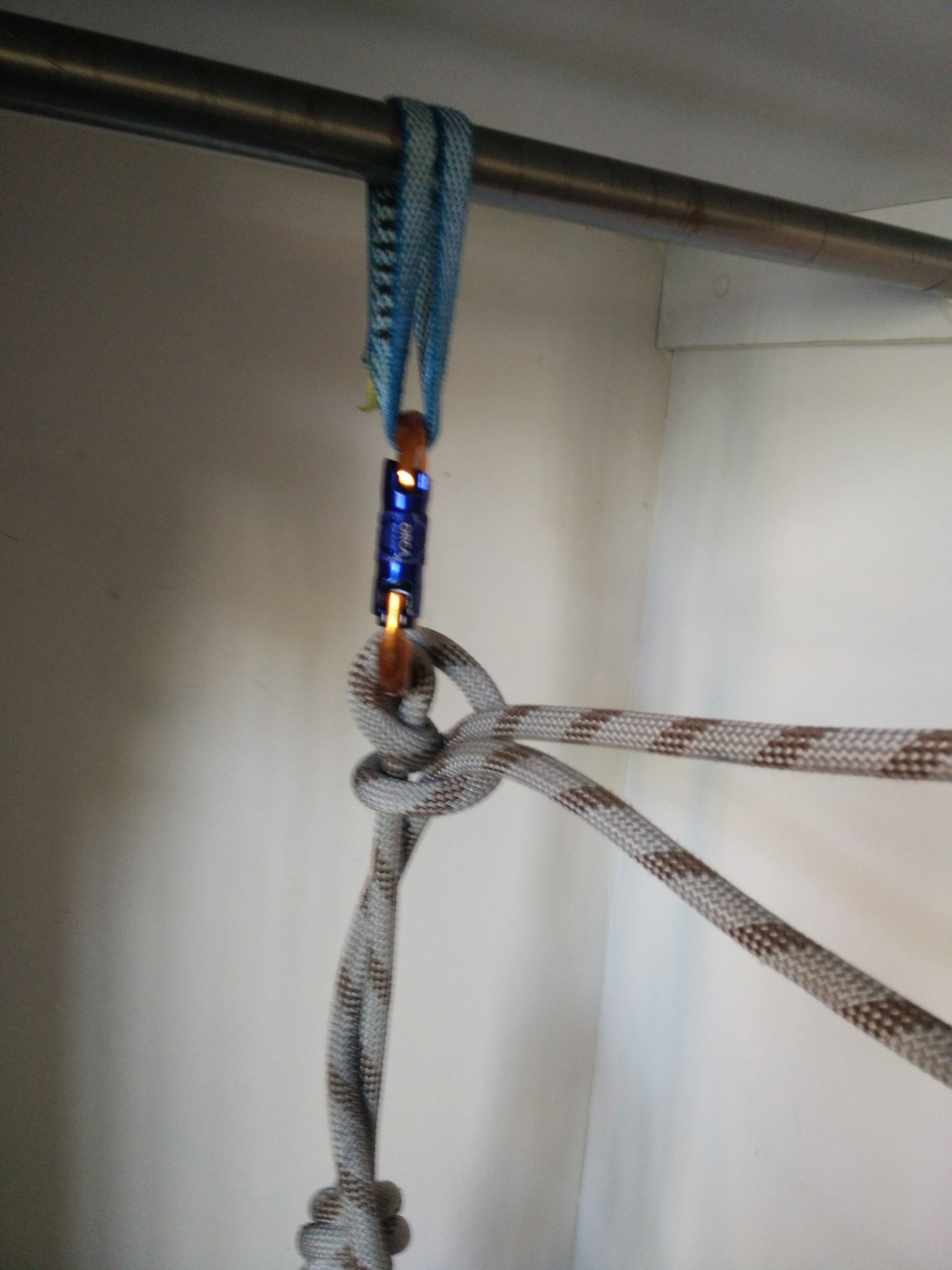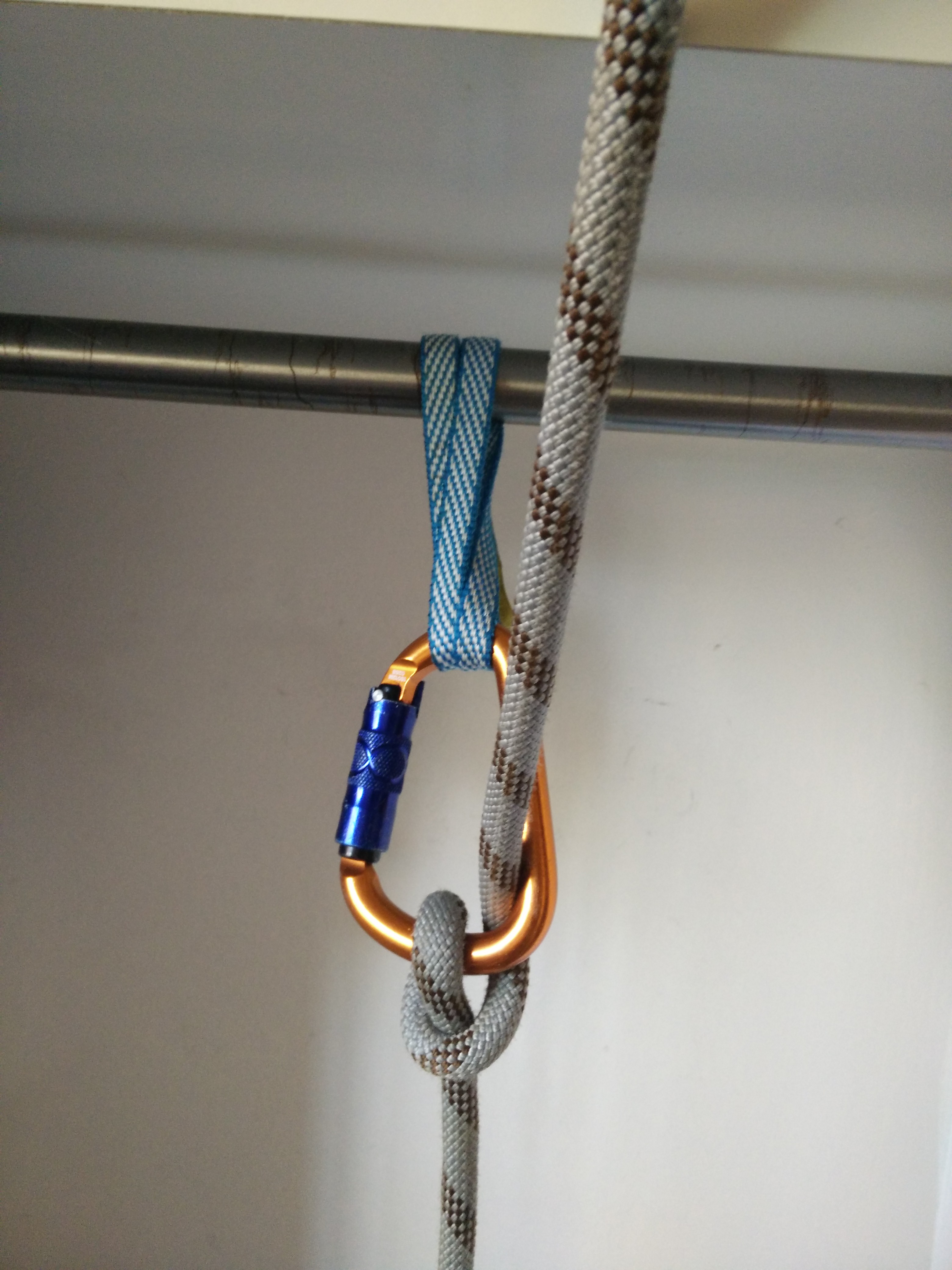 Finally, take your carabiner and attach it to whichever two sections of rope are running next to each other.