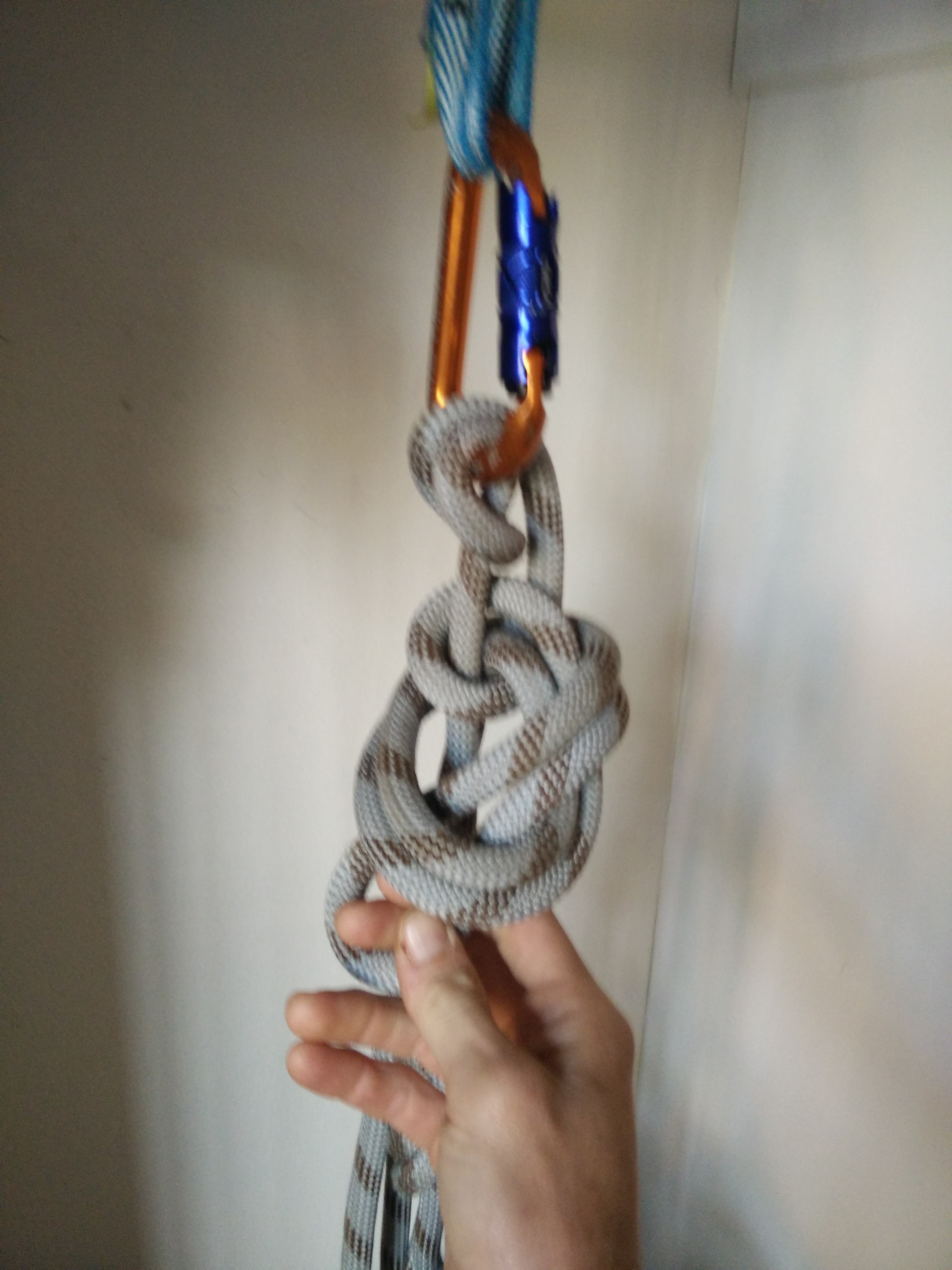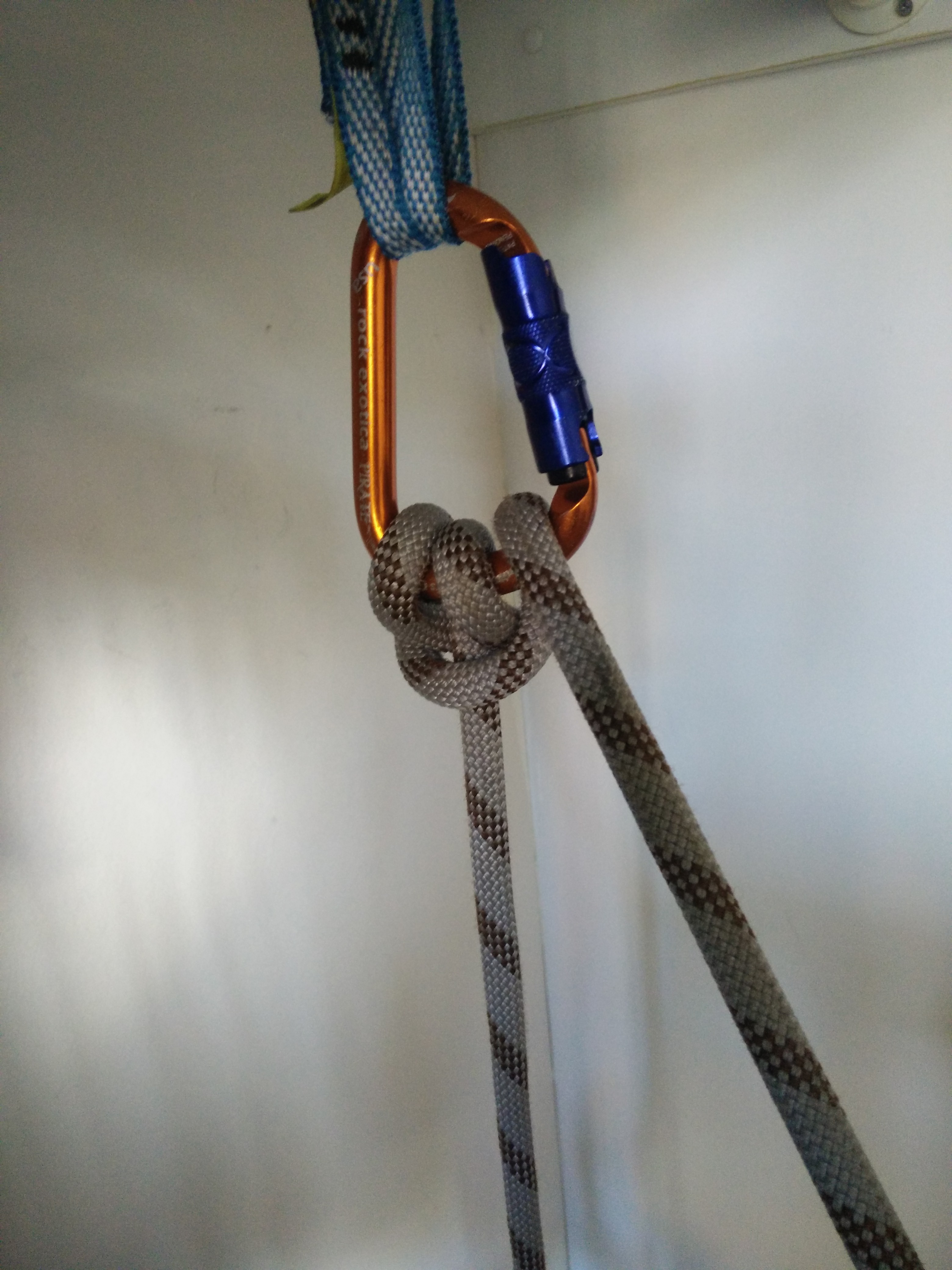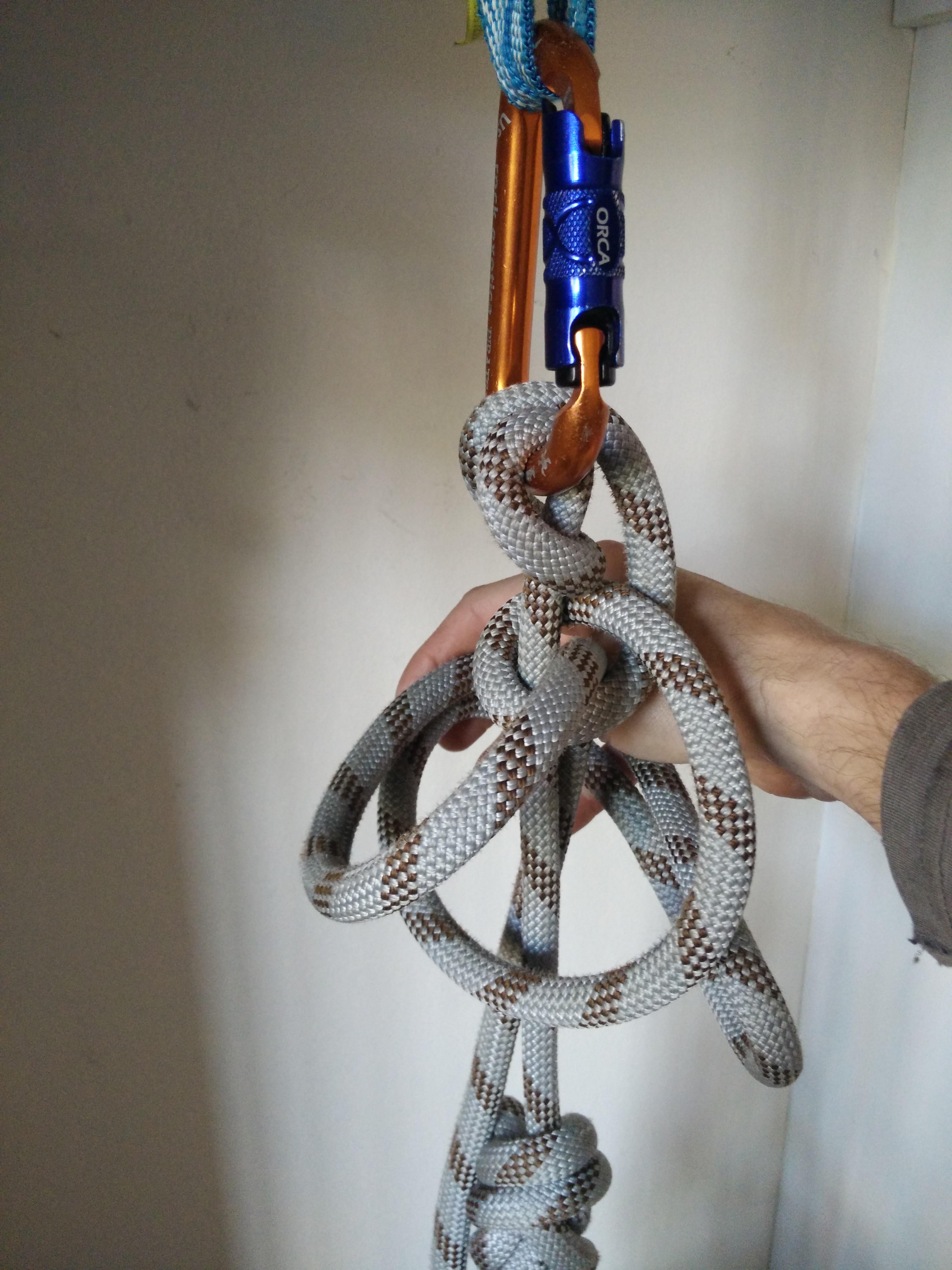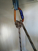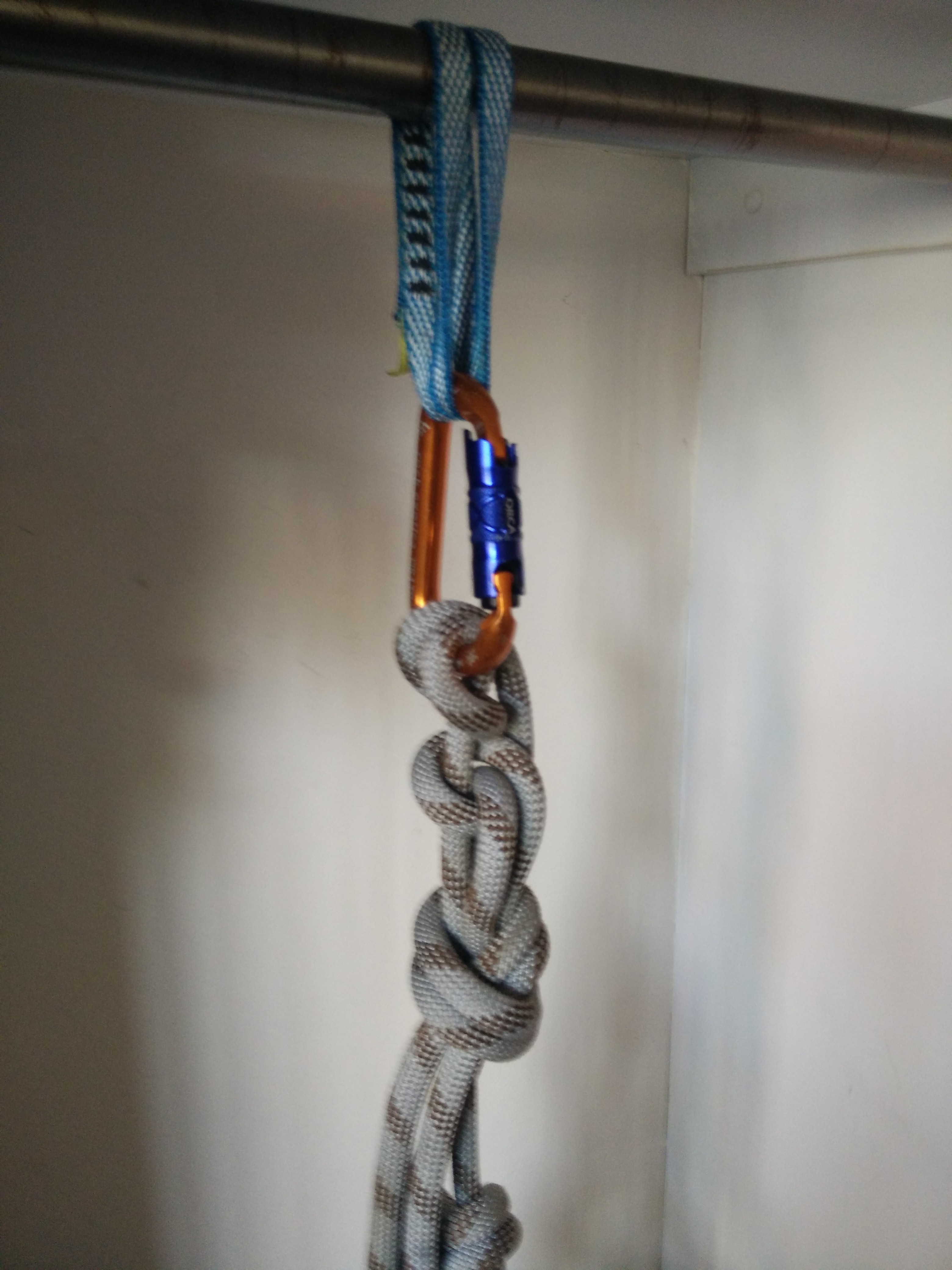 Finally, take your carabiner and attach it to whichever two sections of rope are running next to each other.