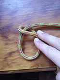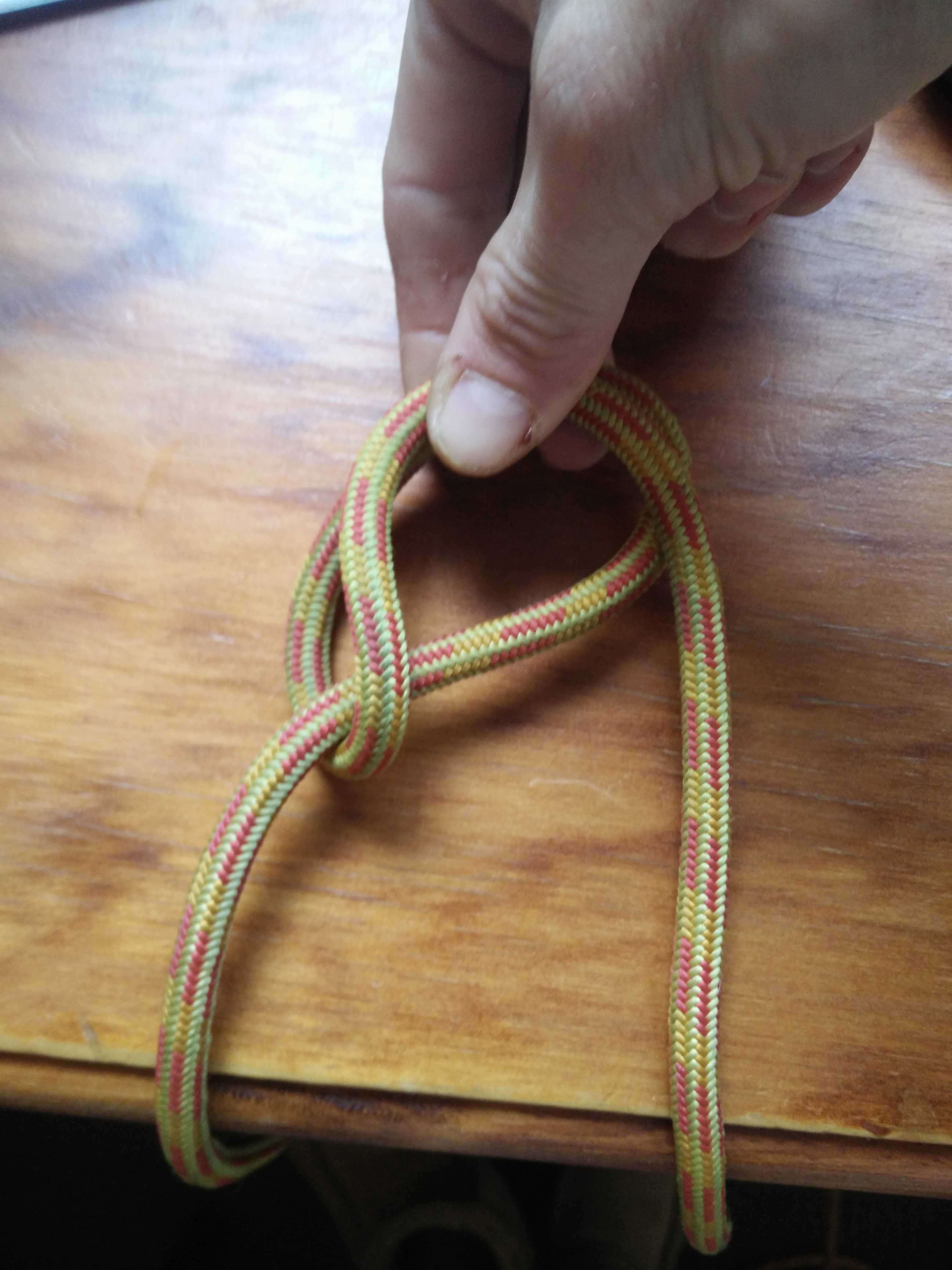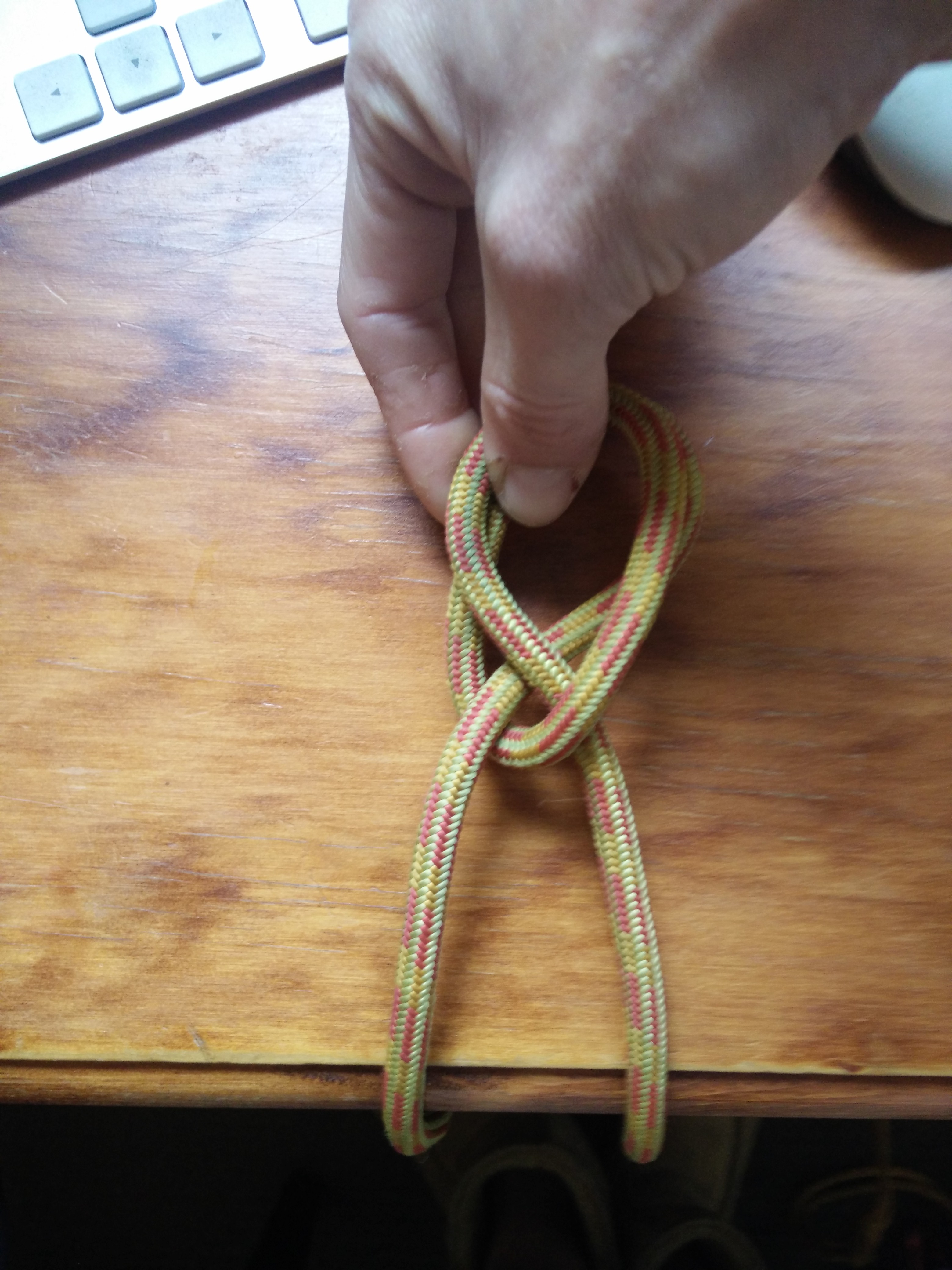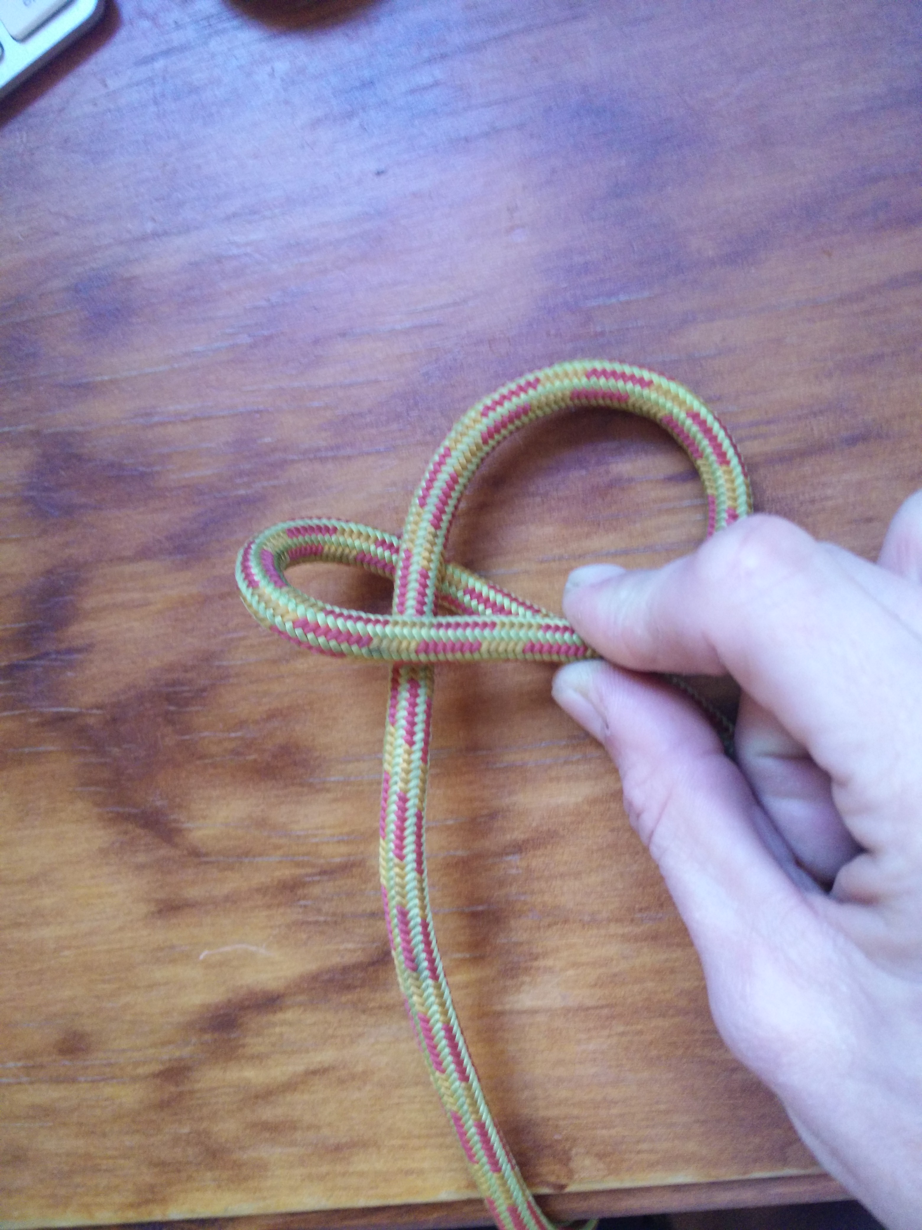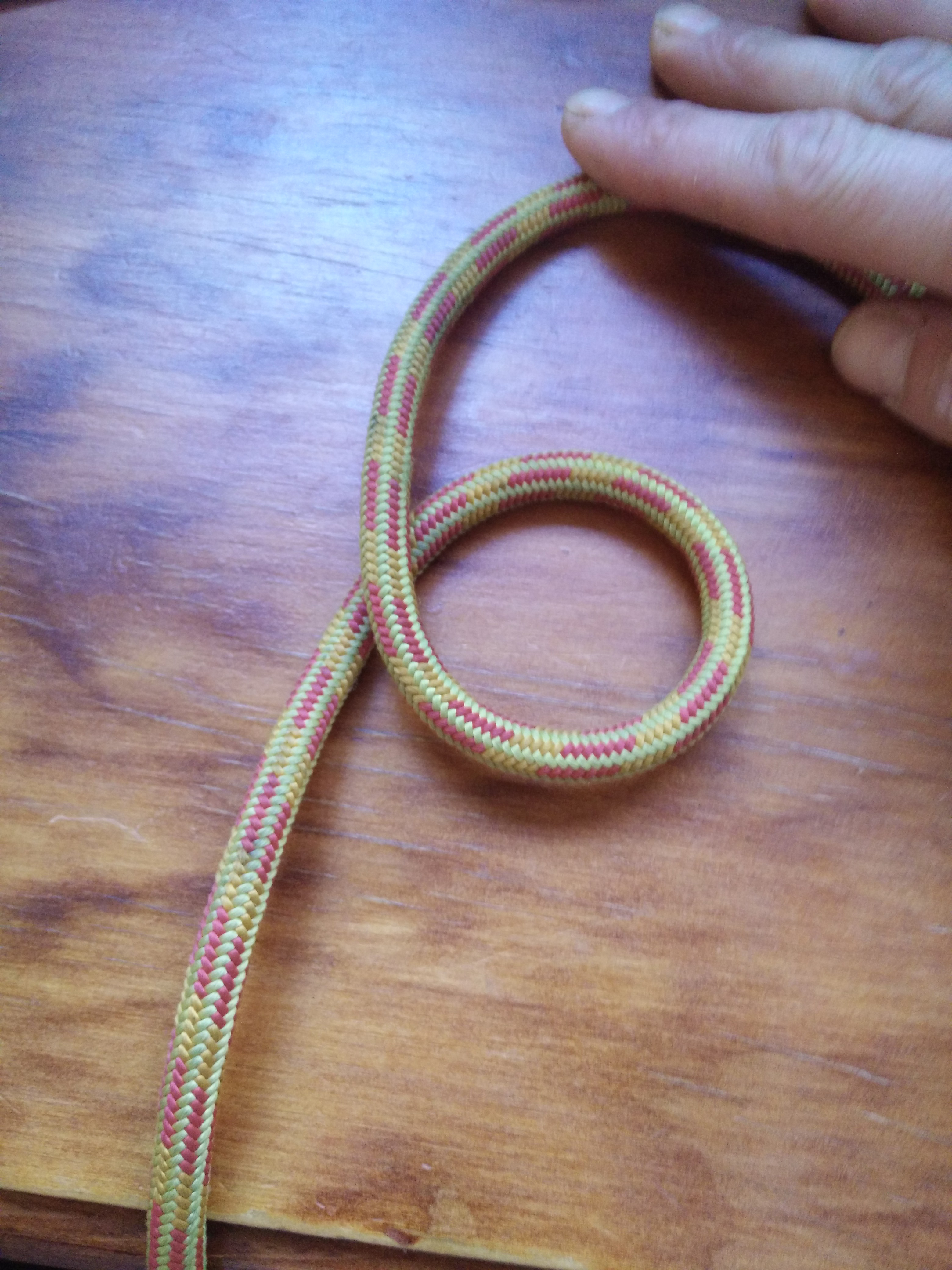 I’ve come across dozens of different ways to tie a Münter hitch. Most of them involve complicated sequences of forming loops and pretending you’re holding a book. Forget all that. Just take your rope and make a loop. Doesn’t matter which way around it is, just any old loop. Now take one of the lines coming out of the loop - again, it doesn’t matter which one - and fold it over the other length of rope and back onto itself.